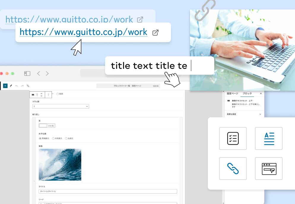 サクサク編集できる!使いやすさを意識したUI設計により、htmlやcssの知識が無くても直感的な操作で自由に編集できるので、ページの編集やカスタマイズがとても簡単に行えます!テキストの編集や画像の追加などリアルタイムな更新・運用で、より充実した最新情報の発信もスムーズです。また、貴社内でサイト管理が行えることからコスト削減にも大きく貢献します。