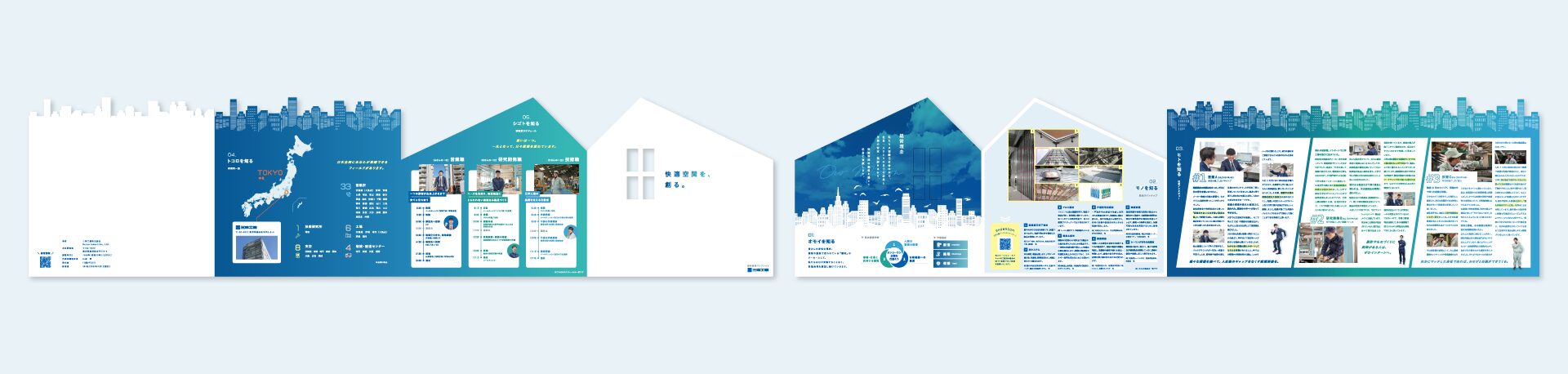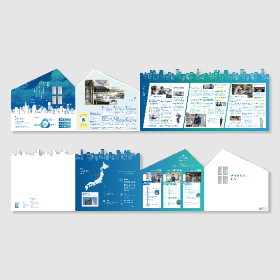 同社は快適な空間づくりをコンセプトにあらゆる建物で使用される建材を扱うメーカー様です。そうした同社の事業イメージを表現するために、街のあらゆる建造物とその中で使用されている建材が、くり抜かれた窓から見える仕様にて「立つパンフレット」を実現しました。