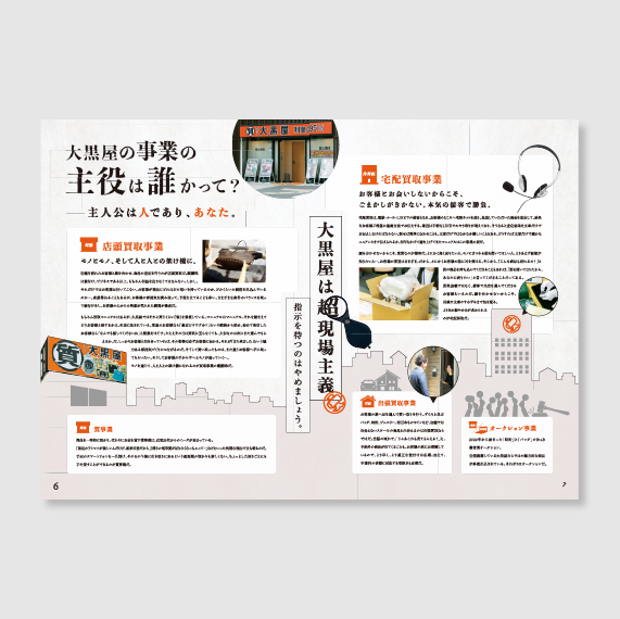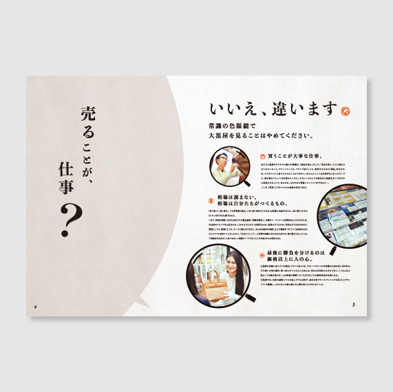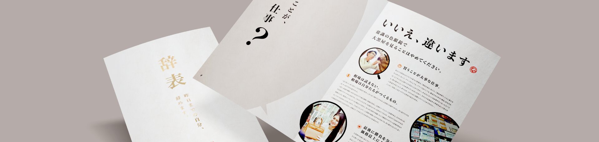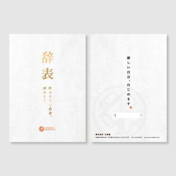 学生が思わず手に取ってしまうような「インパクトのあるものを」というオーダーを元に大黒屋様の挑戦心や遊び心をカタチにできればと、「採用」という目的からは一見真逆の意味をもつ「辞表」をコンセプトに採用パンフレットを制作させていただきました。 決してネガティブな意味合いではありません。同社の「常識」や「過去」に捉われないチャレンジングな社風を表現する中で行き着いたキーワードであり、過去ではなく未来志向の考え方を一貫して表現させていただきました。